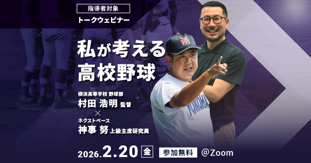春のセンバツで19年ぶり4回目の優勝を飾り、夏の甲子園でもベスト8まで進出した横浜高校 村田浩明監督とネクストベース上級主席研究員 神事努を交え、指導者向けのトークウェビナーを開催します。